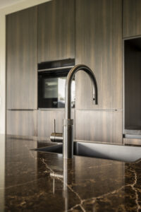 Het werkblad is een echte blikvanger in deze keuken. Het heeft een donkere marmerlook met warme, natuurlijke lijnen die de keuken een luxe en gezellige uitstraling geven. Door het grote oppervlak is er veel ruimte om te koken, spullen neer te zetten en samen aan het eiland te zitten. Het blad ziet er niet alleen mooi uit, maar is ook sterk en handig in het dagelijks gebruik.
