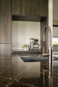 In de kastenwand is een ruime koffienis gemaakt met daarboven handige bovenkasten. Hierdoor hebben de bewoners niet alleen een vaste plek voor hun koffiezetapparaat, maar ook extra opbergruimte voor kopjes, koffie en andere benodigde spullen. De nis houdt het aanrecht schoon en overzichtelijk, terwijl de bovenkasten zorgen dat alles binnen handbereik én uit het zicht blijft.